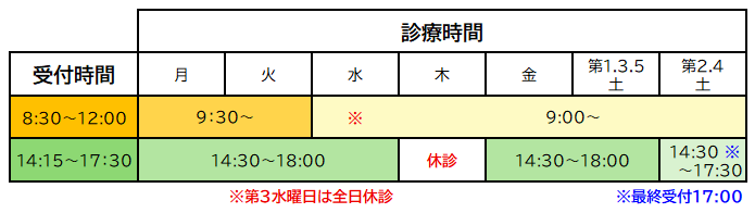 第3水曜日・木曜日午後・日曜日・祝日・GW5月3~5日休診(令和8年度未定)