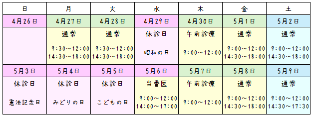 令和7年4月5月(GW)の休診・当番医の日程は下記のとおりとなります。