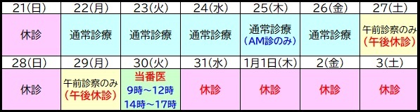 令和6年年末および令和7年年始の休診・当番医の日程は下記のとおりとなります。